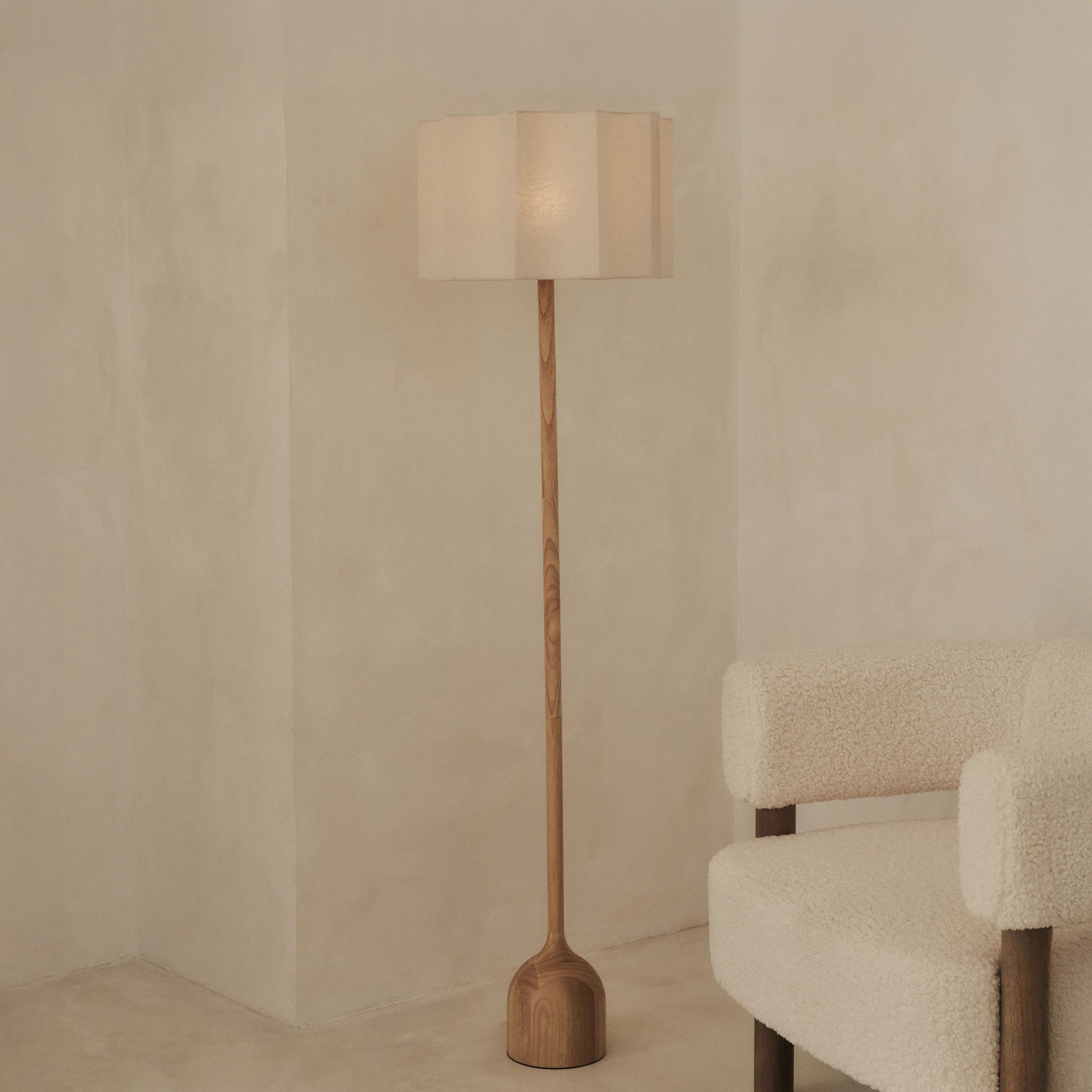 Indulge in the rustic charm of the Esme Floor Lamp. Crafted with a light wood base and finished with a neutral linen inverted scallop style shade, this floor lamp creates a soft and inviting ambience. Perfect for any space in need of a touch of warmth and charm. Elevate your interior with this elegant and exclusive piece.