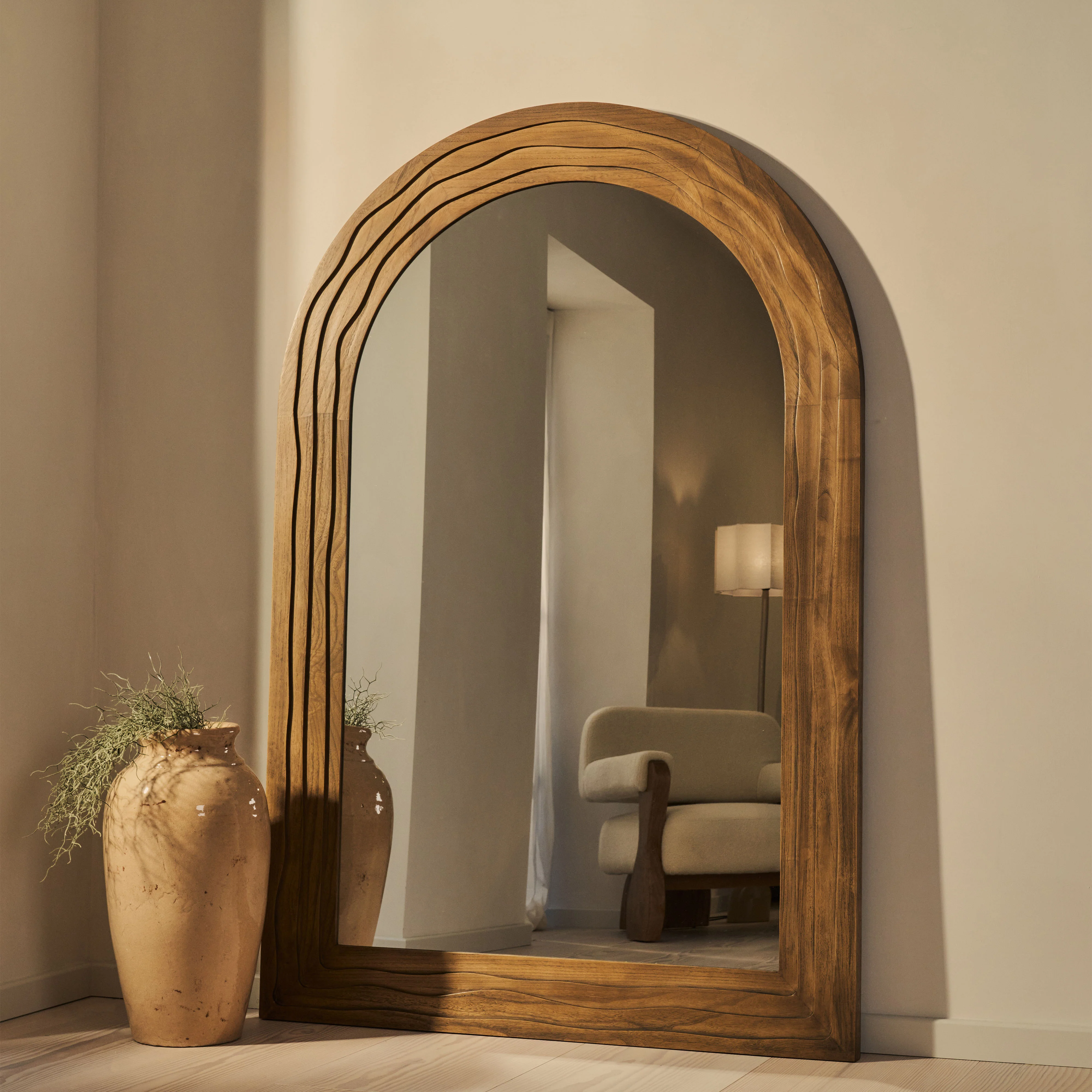 Introducing the Lucelle, a statement piece that commands attention in any room. This extra-large arched mirror showcases masterful craftsmanship with its distinctive ribbed, wave-textured frame that adds genuine depth and visual interest. The rich warm wood finish brings warmth and sophistication to your space, while the generous 180cm x 120cm dimensions make it an architectural focal point. Perfect for creating an illusion of light and space, this full-length mirror combines timeless elegance with contemporary design that elevates your interior effortlessly.